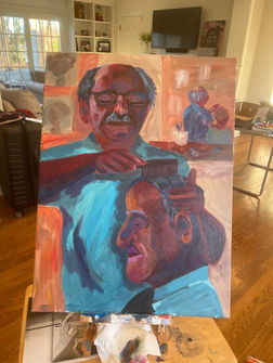 On the right/below is an oil painting of my dad and me. Much of my work is a tribute to his life and a medium to express my own grief.
